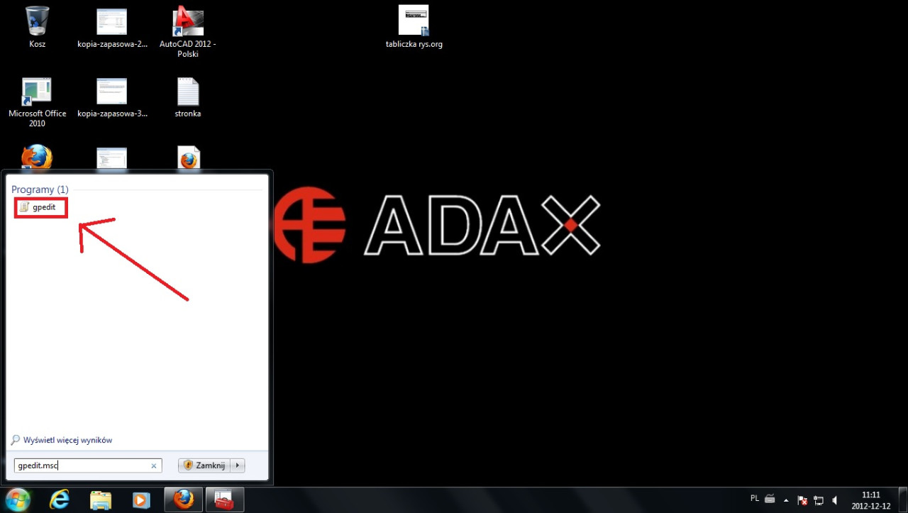 Aby wejść w MMC wciśnij przycisk Start i w polu Wyszukaj programy i pliki wpisz gpedit.msc.