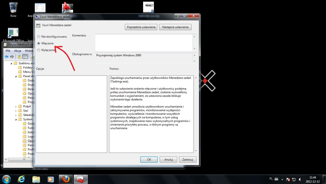 system--->Opcje klawiszy Alt+Ctrl+del ---->Usuń menadżer zadań(zaznacz)--->prawy przycisk myszki--->edycja---> zaznaczamy opcje Włączone---> i dajemy zastosuj.