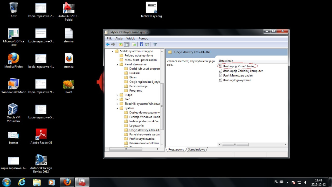 system--->Opcje klawiszy Alt+Ctrl+del ---->Usuń opcje Zmień hasło(zaznacz)--->prawy przycisk myszki--->edycja---> zaznaczamy opcje Włączone---> i dajemy zastosuj.