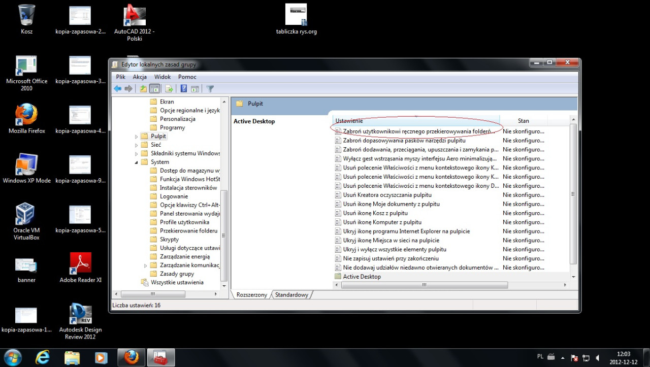 Panel Sterowania---->Pulpit--->Zabroń użytkownikowi ręcznego przekierowywania folderów profilów.--->Edycja---> Włącz