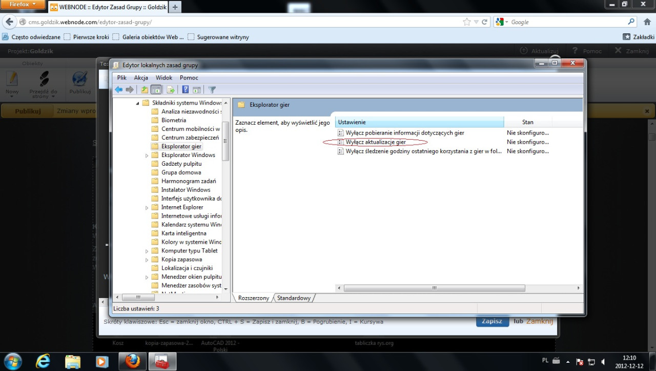 Składniki systemu Windows------>Eksplorator Gier----->Wyłącz aktualizacje Gier---->Edytuj----->Włącz
